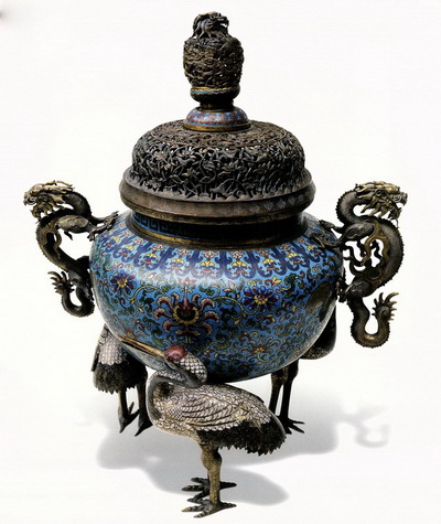 Cloisonne enamel censer with design of intertwined lotus and its feet in the shape of cranes,Ming Dynasty