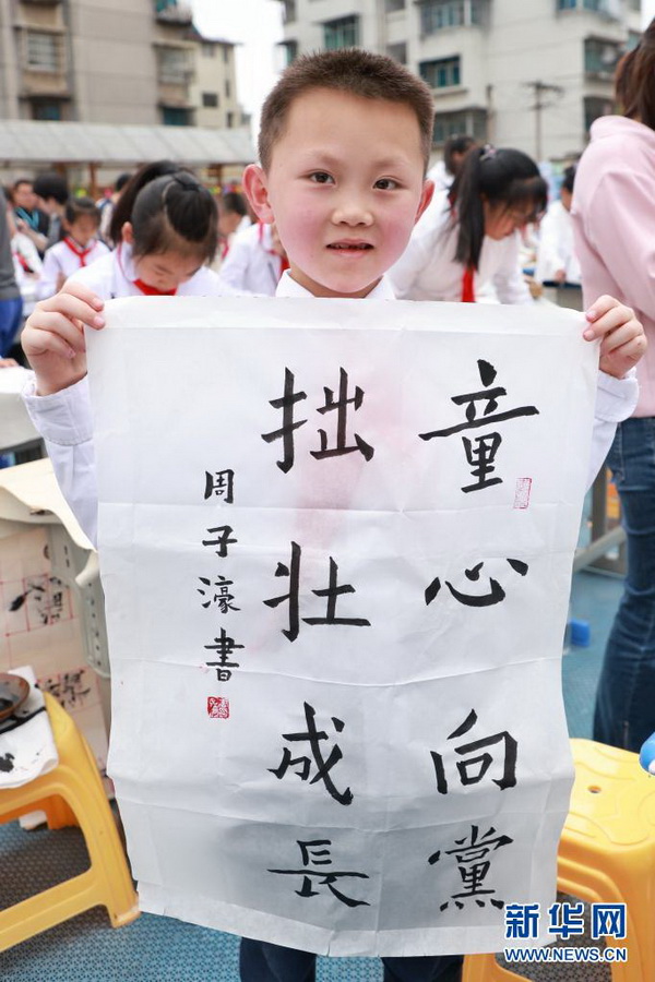 On May 19th, elementary school students are showing their calligraphy works. Photo by Xinhua News Agency reporter Liu Xu