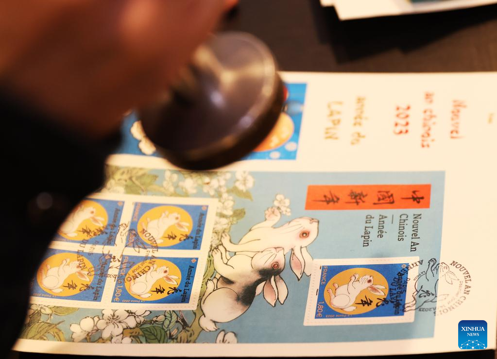 The Year of the Rabbit commemorative stamps, designed by Chinese artist Chen Jianghong, are seen during a launching ceremony in Paris, France, Jan. 14, 2023. (Xinhua/Gao Jing)
