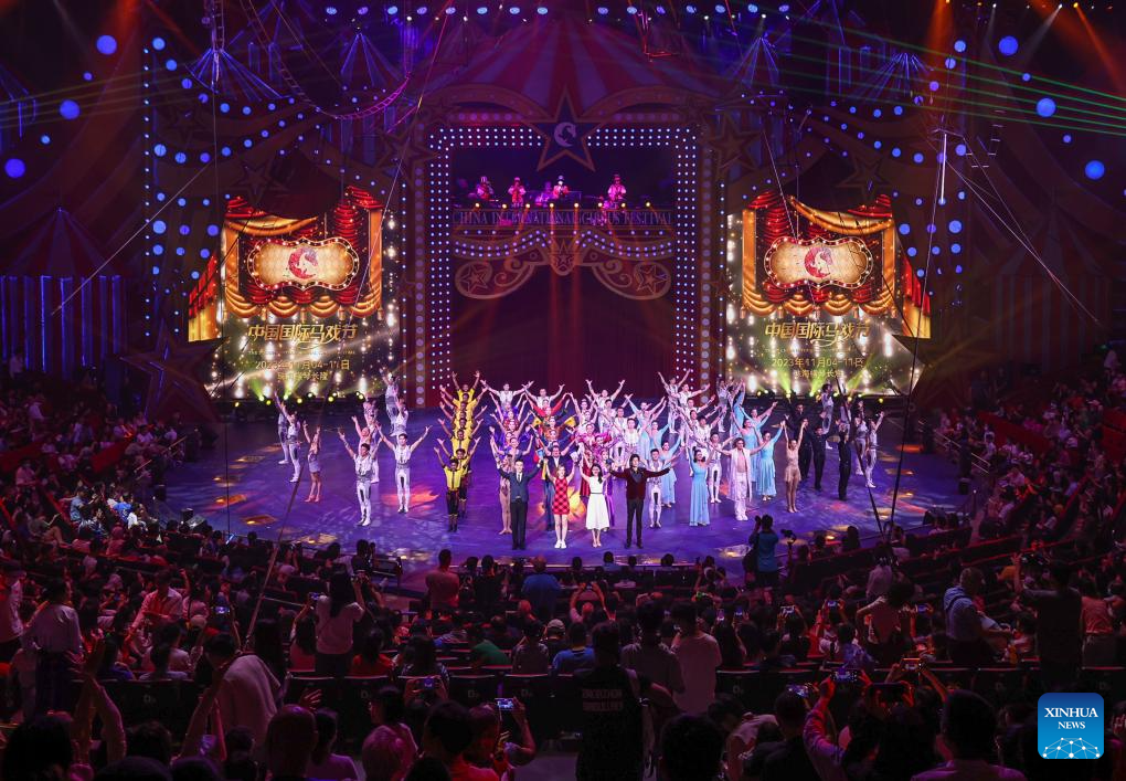 Acrobats take their curtain call after a performance during the 7th China International Circus Festival in Zhuhai, south China's Guangdong Province, Nov. 5, 2023. Nearly 200 acrobats from 18 countries and regions participated in the event. (Xinhua/Liu Dawei)