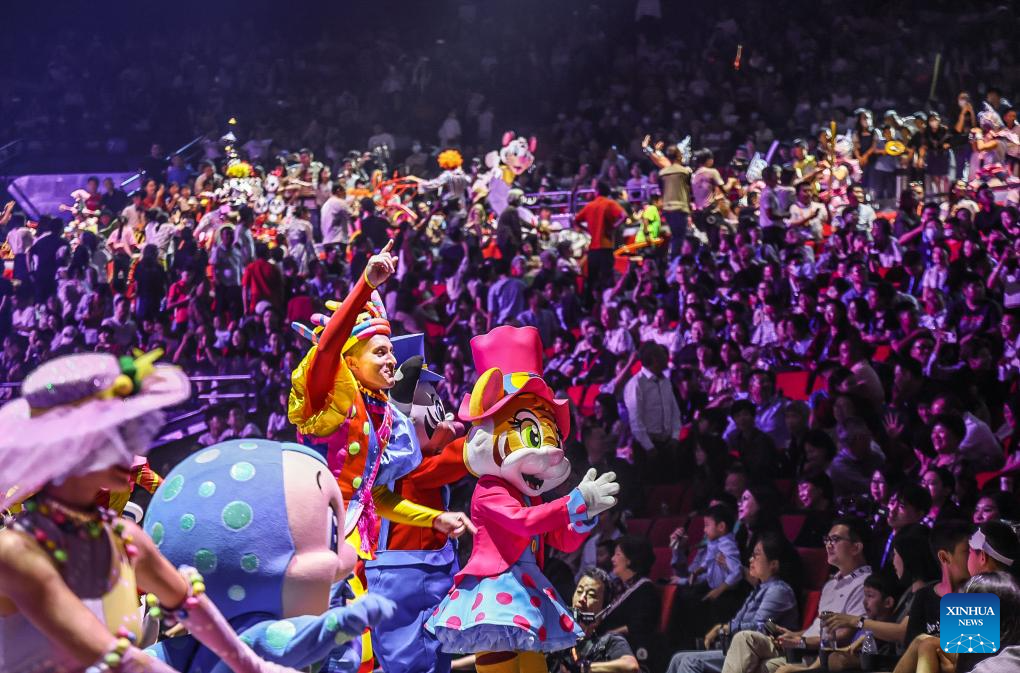 Acrobats interact with the audience at the opening ceremony of the 7th China International Circus Festival in Zhuhai, south China's Guangdong Province, Nov. 4, 2023. Nearly 200 acrobats from 18 countries and regions participated in the event. (Xinhua/Liu Dawei)
