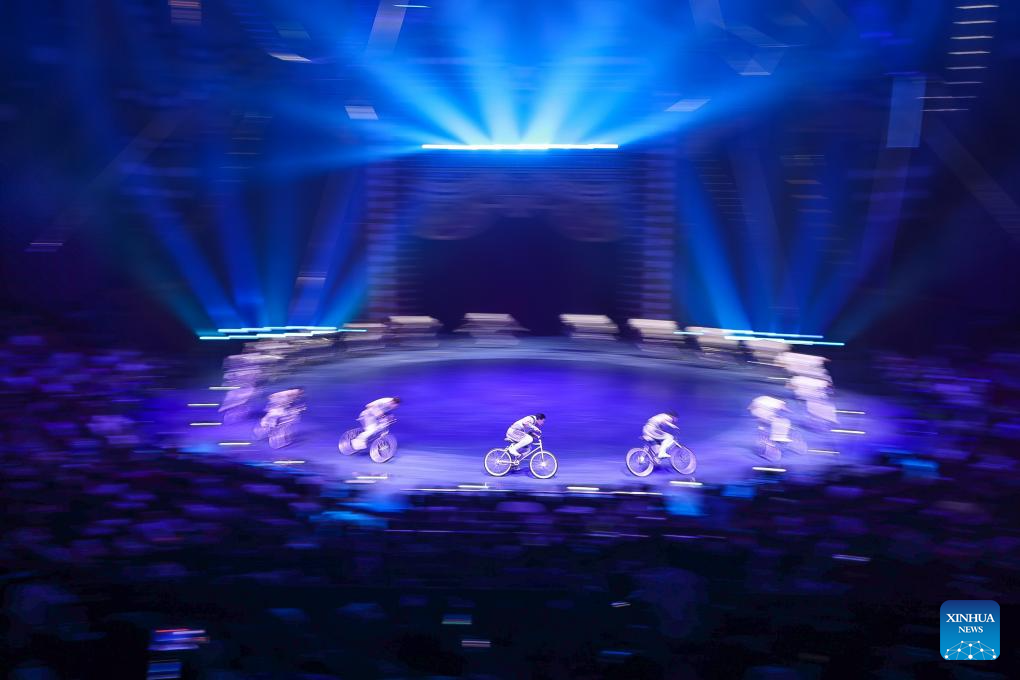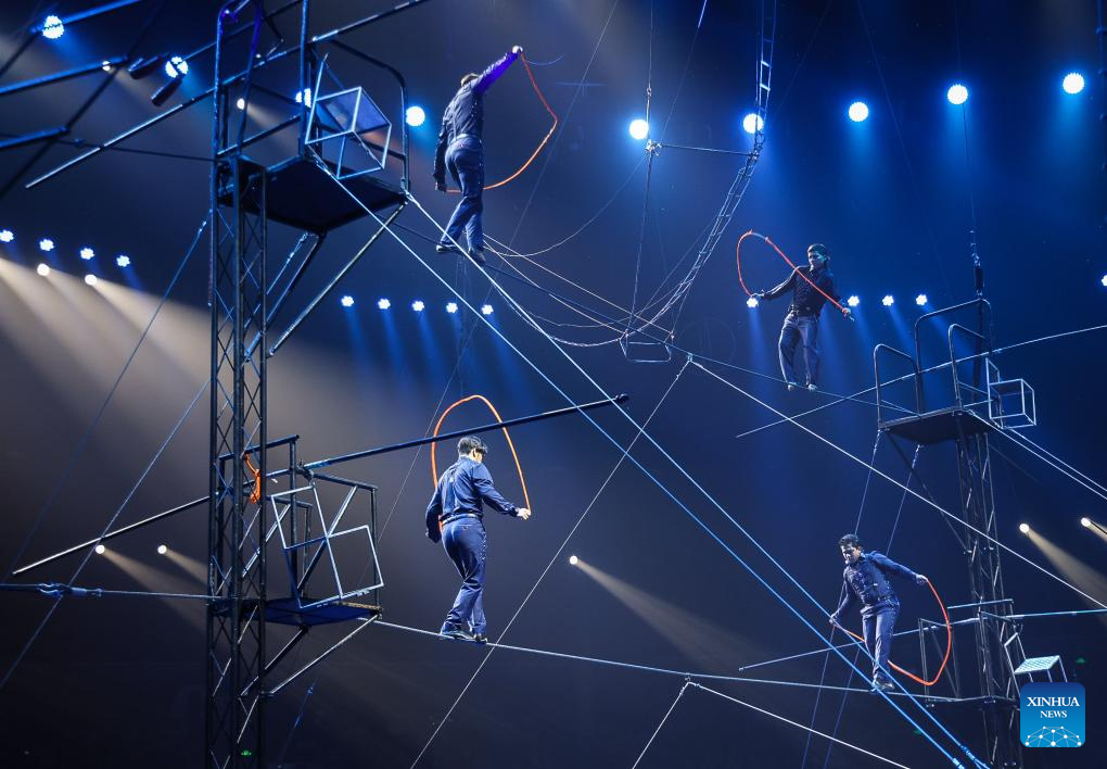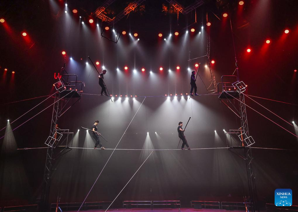 Acrobats from the China National Acrobatic Troupe perform during the 7th China International Circus Festival in Zhuhai, south China's Guangdong Province, Nov. 5, 2023. Nearly 200 acrobats from 18 countries and regions participated in the event. (Xinhua/Liu Dawei)