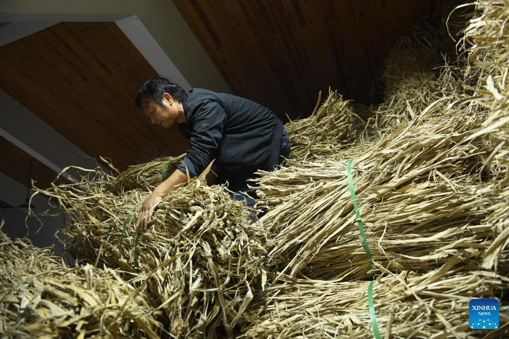 Huang Hongjian piles up the raw material for papermaking at his studio in Kaihua County of Quzhou, east China's Zhejiang Province, Nov. 9, 2023. (Xinhua/Weng Xinyang)