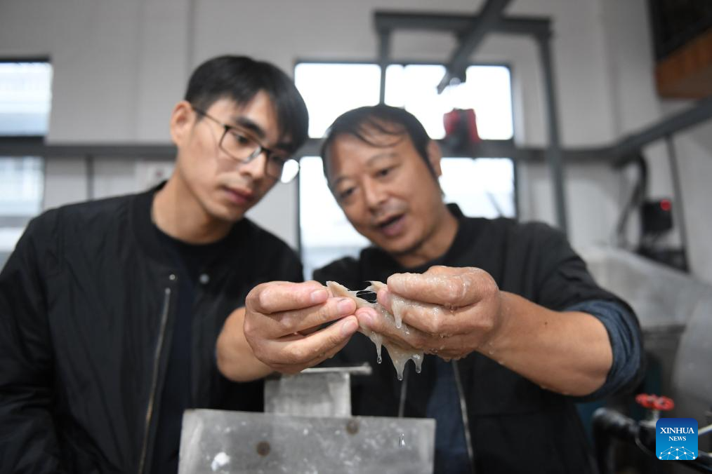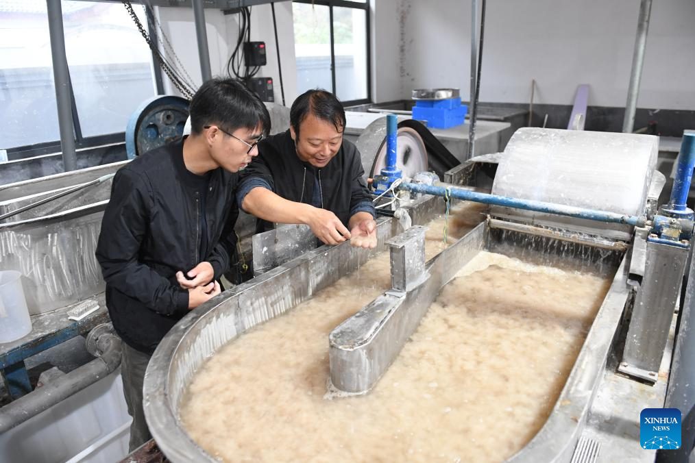 Huang Hongjian (R) and his son Huang Xinkang check the pulp used to make paper at his studio in Kaihua County of Quzhou, east China's Zhejiang Province, Nov. 9, 2023. (Xinhua/Weng Xinyang)