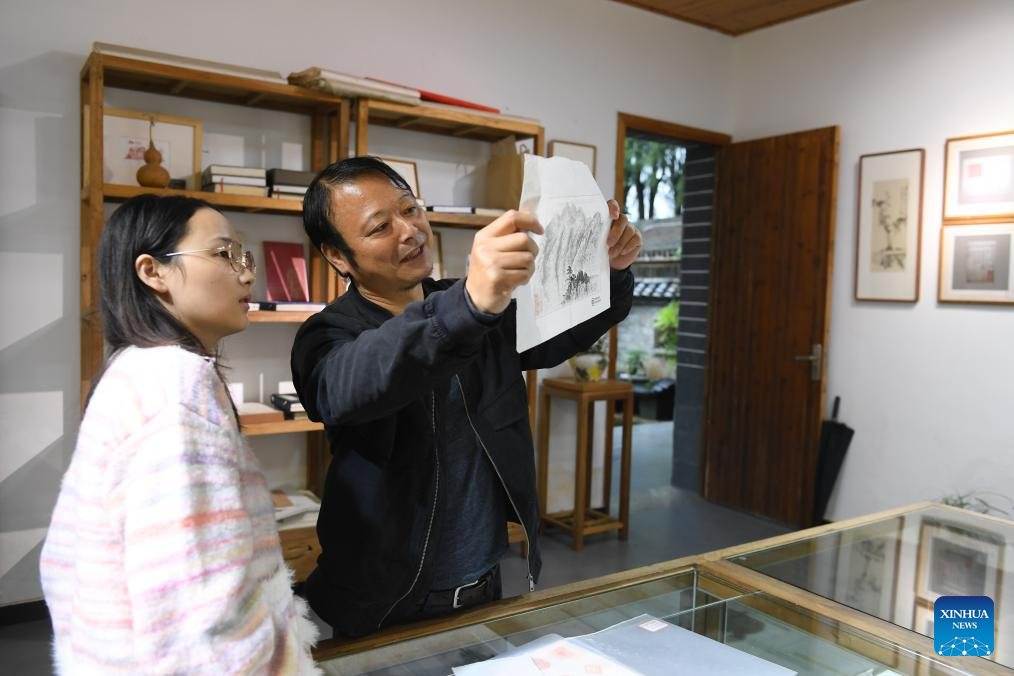 Huang Hongjian (R) shows a visitor the details of the paper he made at his studio in Kaihua County of Quzhou, east China's Zhejiang Province, Nov. 9, 2023. (Xinhua/Weng Xinyang)