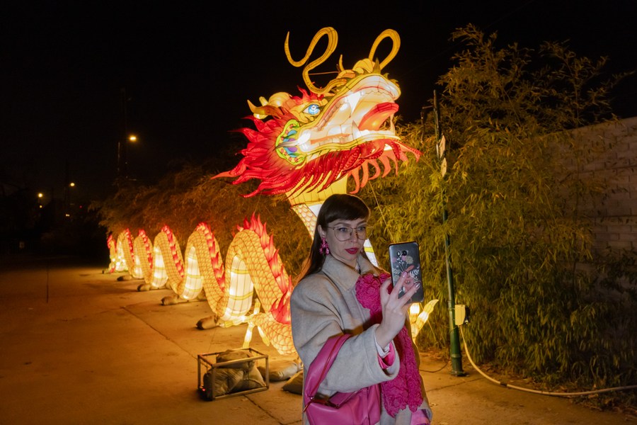A visitor takes selfies at the Year of the Dragon Lantern Festival in Budapest Zoo in Budapest, Hungary, Dec. 16, 2023. (Photo by Attila Volgyi/Xinhua)