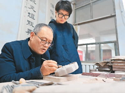 Lin Xiaolin carves on a Chengni inkstone in north China's Shanxi Province. (Xinhua/Yang Chenguang)