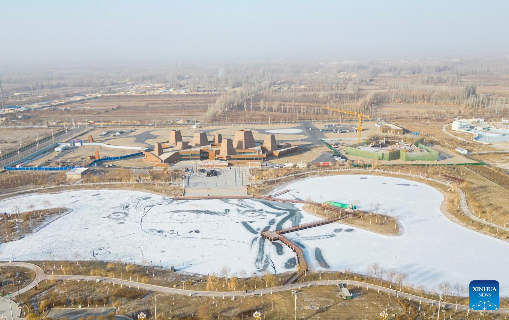 This aerial photo taken on Dec. 29, 2023 shows the Silk Road and Great Wall Culture Museum in Yuli County, northwest China's Xinjiang Uygur Autonomous Region.