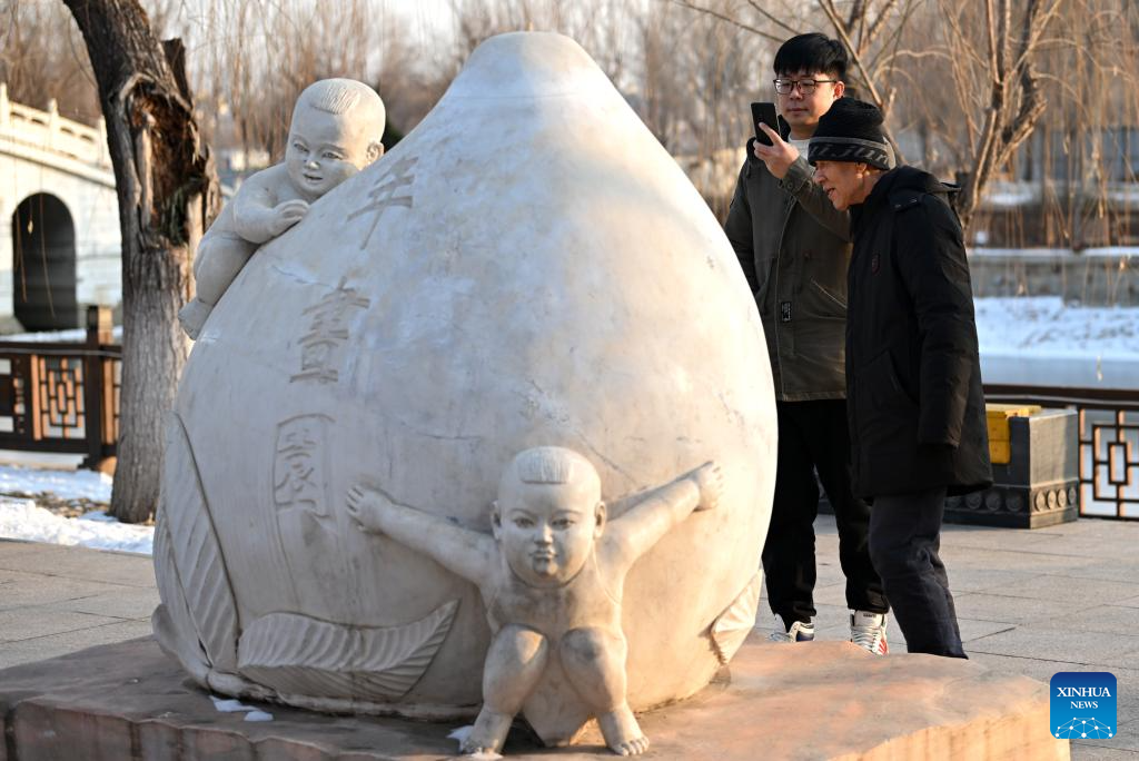 Xi Wang (L) and his mentor Wang Wenda visit a new year picture-themed park in Tianjin, north China, Dec. 27, 2023. (Xinhua/Li Ran)
