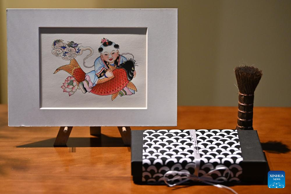 A new year picture is displayed at the Tianjin Yangliuqing Woodblock New Year Picture Museum in Tianjin, north China, Dec. 26, 2023. (Xinhua/Li Ran)