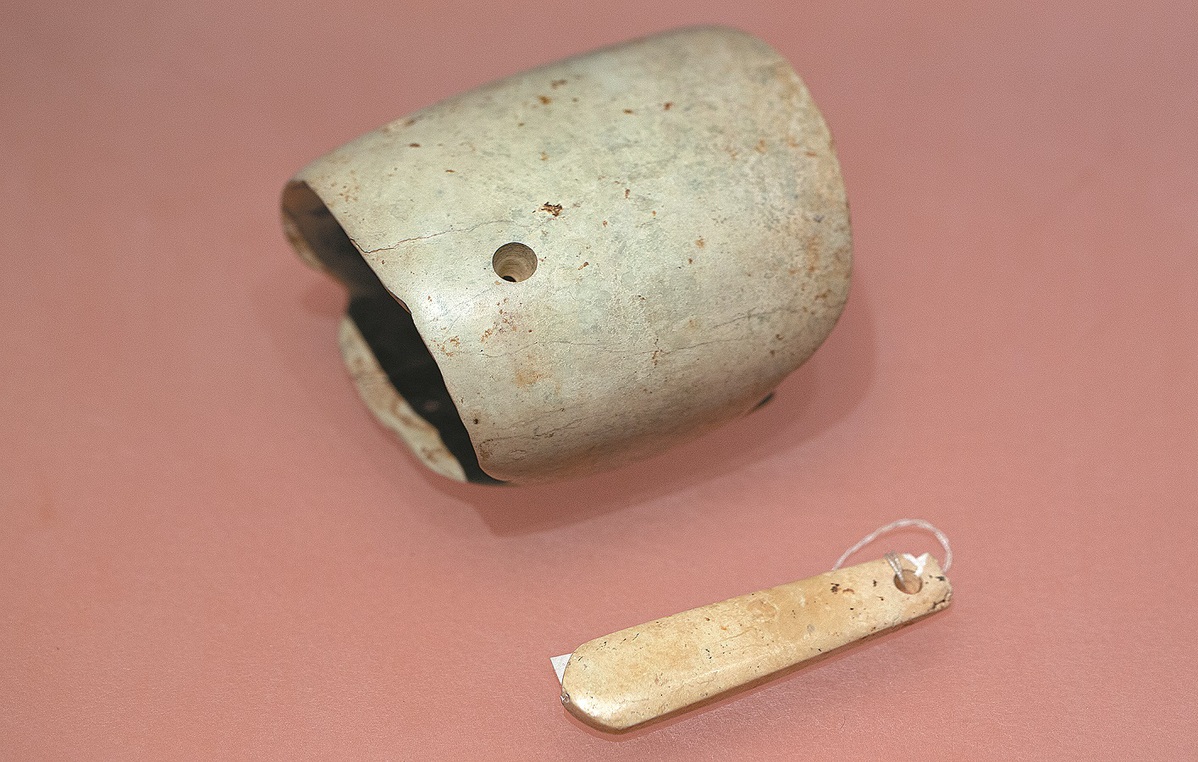 A turtle-shaped oblate vessel and a jade stick from the Lingjiatan site in Anhui province is on display at Anhui Museum in Hefei, on Dec 6, 2022. CHINA DAILY