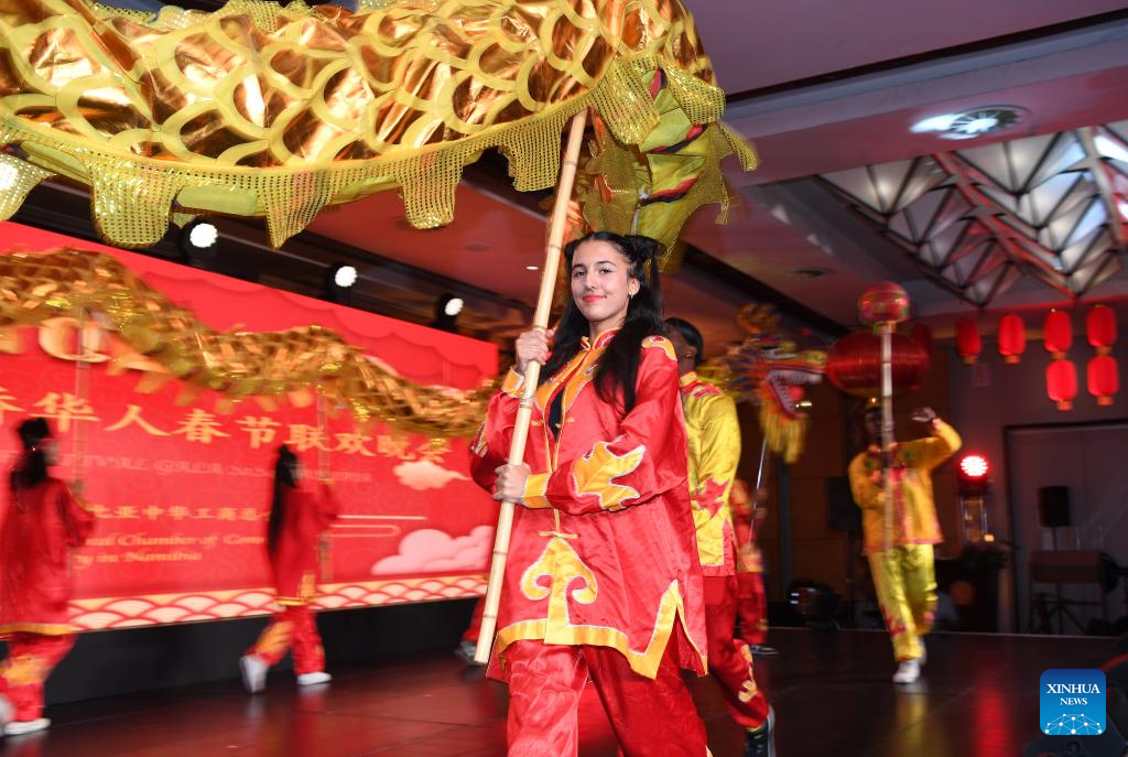 Dancers studying at the University of Namibia perform at the "Happy Spring Festival" party in Windhoek, Namibia, on Jan. 20, 2024. (Photo by Musa Kaseke/Xinhua)