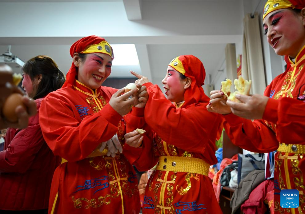 Folk artists prepare for a national Shehuo competition in Guyuan, northwest China's Ningxia Hui Autonomous Region, Feb. 24, 2024. (Xinhua/Feng Kaihua)