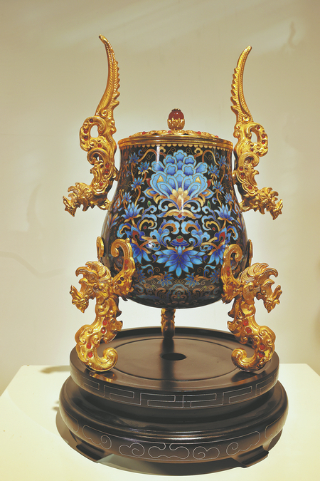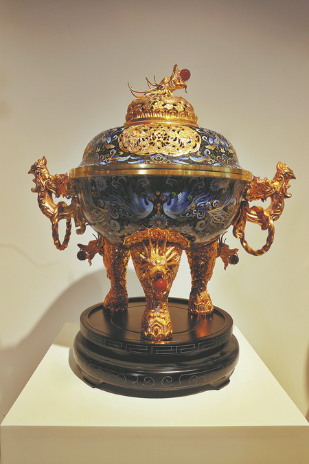 Zhang Yongzhen and Xi Wen's creations of cloisonne vessels feature traditional patterns and are inspired by ancient bronze ware. JIANG DONG/CHINA DAILY