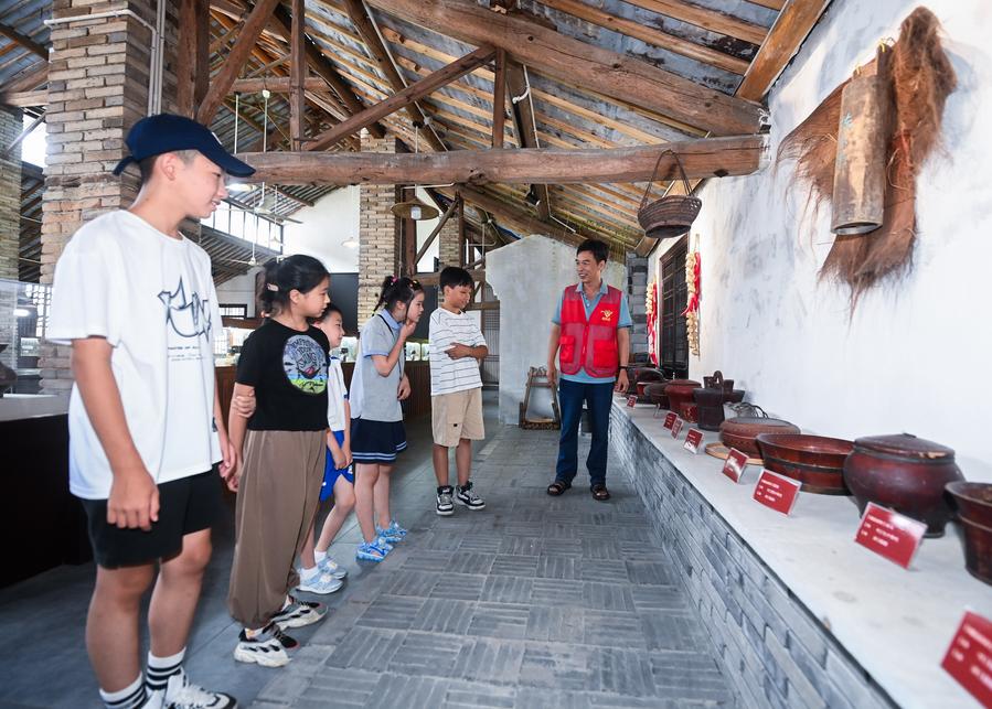 A volunteer introduces exhibits to children visiting a museum at Zhuangyuan Village in Majian Town, Zhuji City, east China's Zhejiang Province, July 25, 2023. (Xinhua/Xu Yu)