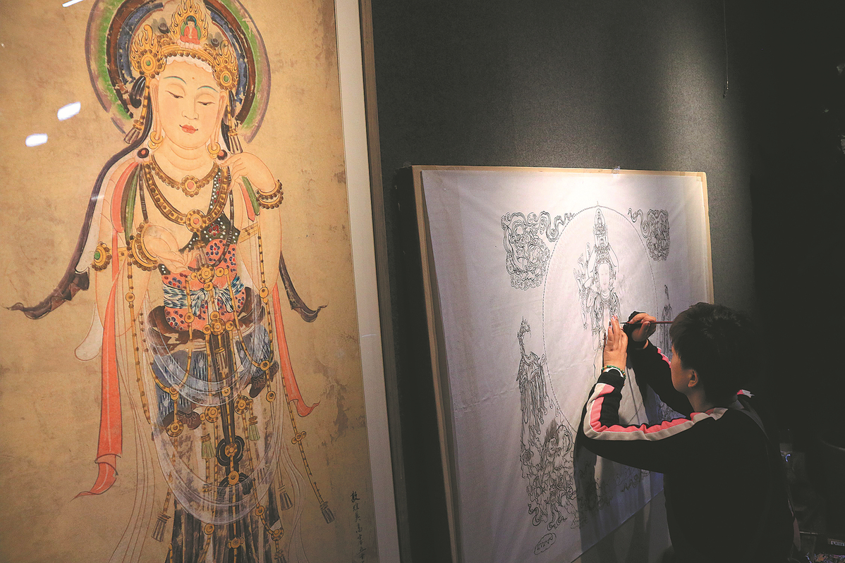 A student copies a wall painting from the Mogao Grottoes during a study tour in Dunhuang in February last year. ZHANG XIAOLIANG/XINHUA