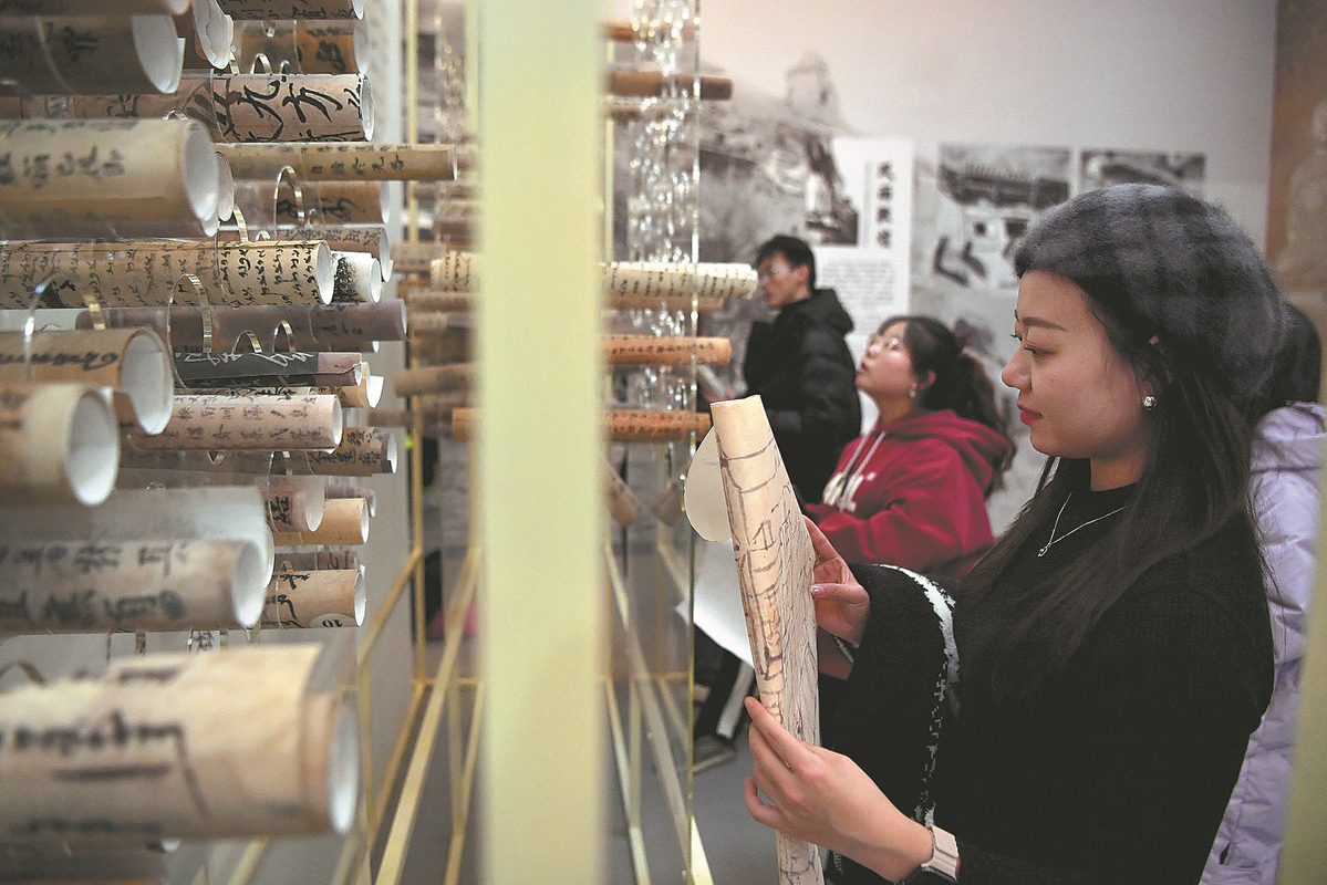 Visitors peruse paintings and scripture scrolls at Dunhuang Art Gallery, which is operated by the academy, in Lanzhou, Gansu province, in April. CHEN BIN/XINHUA