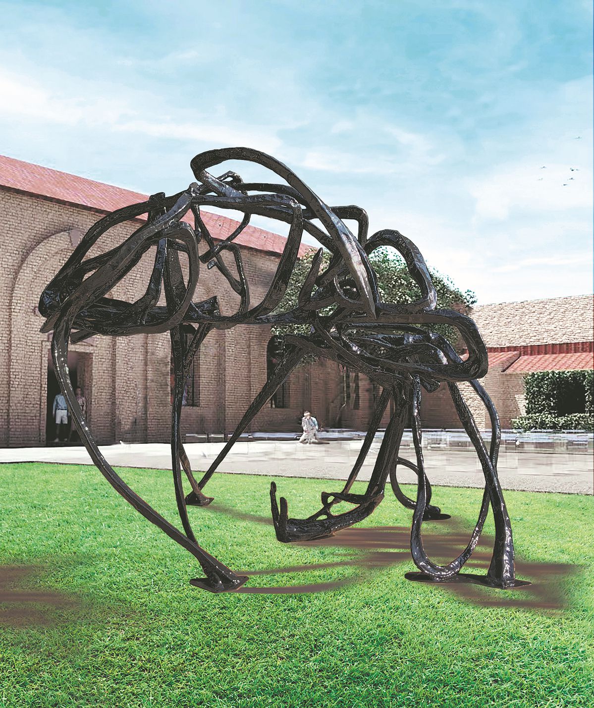 Qiu Zhenzhong's Status Series sculptures are placed in the national pavilion's garden and reproduce the brush strokes of calligraphy in the concrete lines of the sculptures. In the curator's words, calligraphy is the origin of Chinese ink paintings.