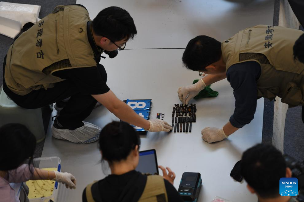 Archaeologists inventory the relics unearthed from the Wuwangdun tomb discovered in Huainan, east China's Anhui Province, May 20, 2024.(Xinhua/Zhang Duan)