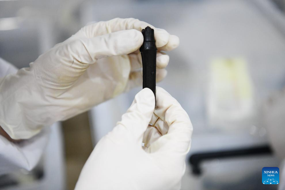 An archaeologist observes a relic unearthed from the Wuwangdun tomb discovered in Huainan, east China's Anhui Province, May 20, 2024. (Xinhua/Zhang Duan)