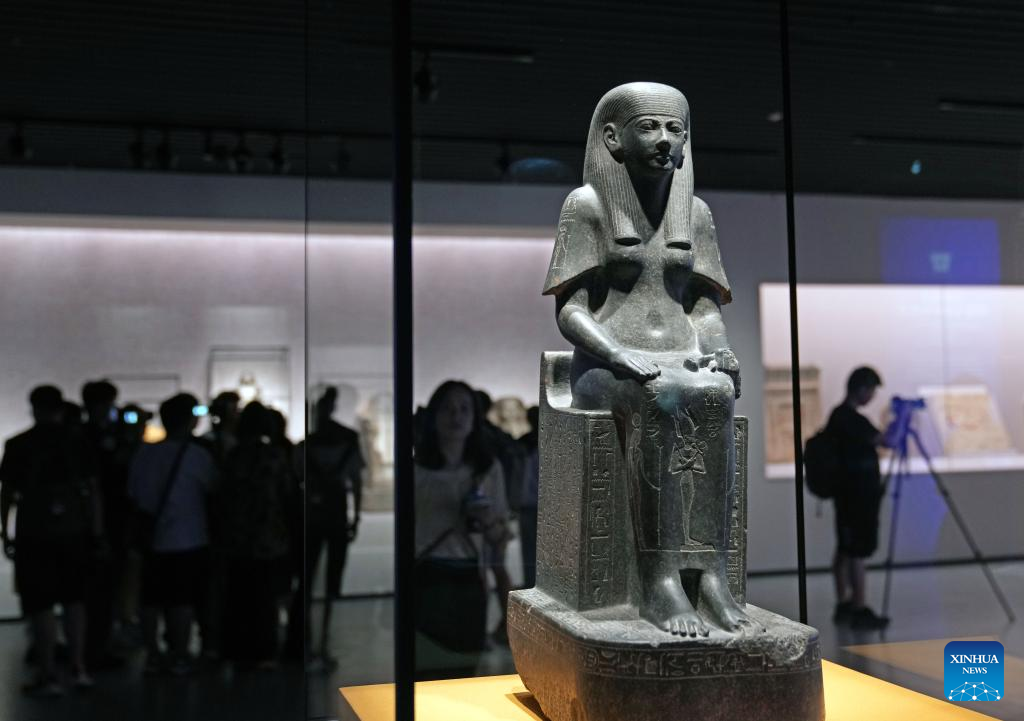 Visitors look at a statue during a media preview of the exhibition "On Top of the Pyramid: The Civilization of Ancient Egypt" at the Shanghai Museum in east China's Shanghai, July 16, 2024. The opening ceremony of the exhibition was held Wednesday at the Shanghai Museum on the People's Square of the city. The exhibition will be open to public on July 19, bringing Chinese visitors altogether 788 precious artifacts from different periods of ancient Egypt, most of which are being displayed in Asia for the first time. The exhibition will run until August 2025. (Xinhua/Liu Ying)