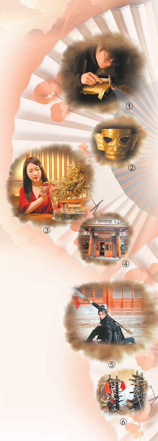 ①: Wang Xinge, a young vlogger in China, makes a replica of an ancient gold mask, based on a fragment of a gold mask unearthed at the famous Sanxingdui Ruins in southwest China's Sichuan Province. (Photo courtesy of Wang Xinge)
