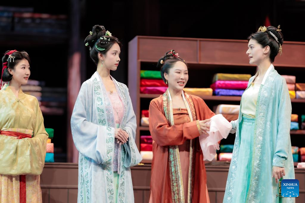 Tunisian girl Sana Hadhri (1st R) and Chinese actress Chen Duling (2nd L) perform during the shooting of an episode of the National Treasure 4 in Beijing, capital of China, June 13, 2024.(National Treasure/Handout via Xinhua)