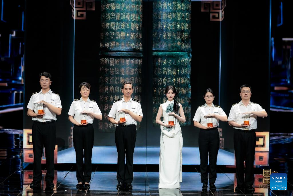 Chinese customs officers, along with Chinese actress Mao Xiaotong (3rd L), jointly pledge to guard gilded bronze tallies issued by the King of Chu during the Warring States Period (475-221 BC), during the shooting of an episode of the National Treasure 4 in Beijing, capital of China, June 12, 2024.(National Treasure/Handout via Xinhua)