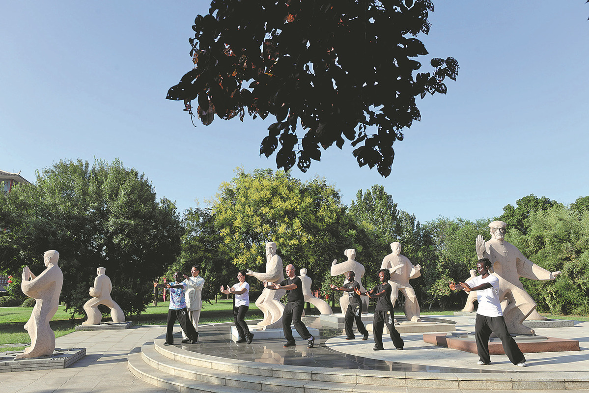 Participants in a tai chi cultural exchange program practice the martial arts at a park in Chenjiagou, Henan province.[Photo by Xu Hongxing/for China Daily]