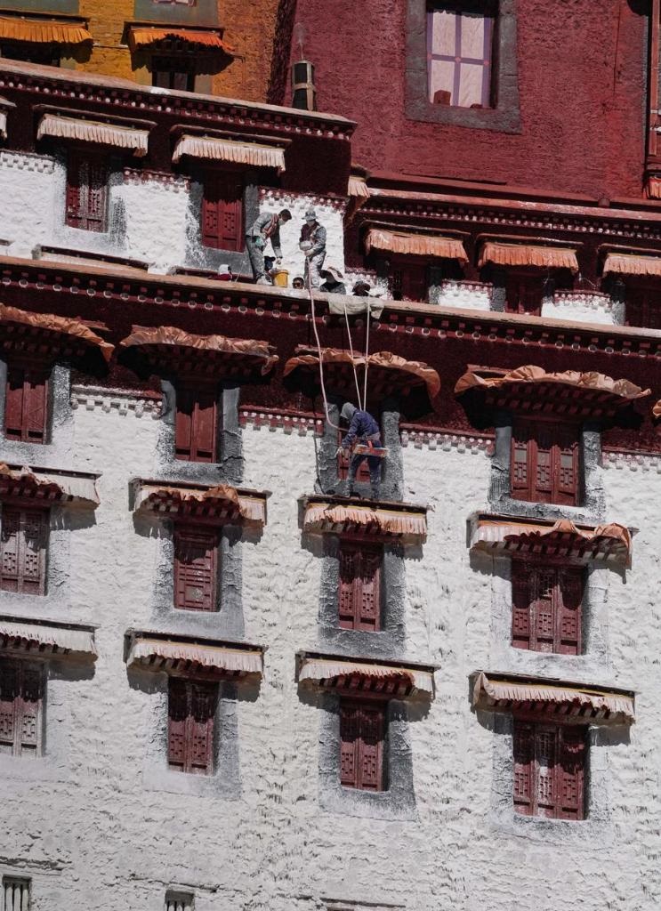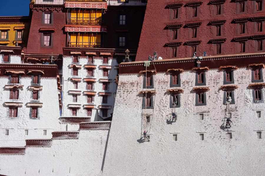 Workers paint the wall of the Potala Palace during an annual renovation of the ancient architectural complex in Lhasa, southwest China's Xizang Autonomous Region, Oct. 29, 2024. (Xinhua/Jigme Dorje)