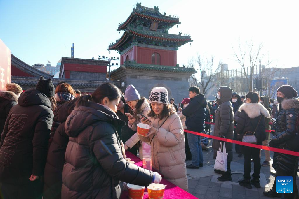 People receive free Laba porridge at a cultural event held by Beijing Folk Art Museum in Beijing, capital of China, Jan. 7, 2025. This year's Laba Festival falls on Tuesday. (Xinhua/Ju Huanzong)