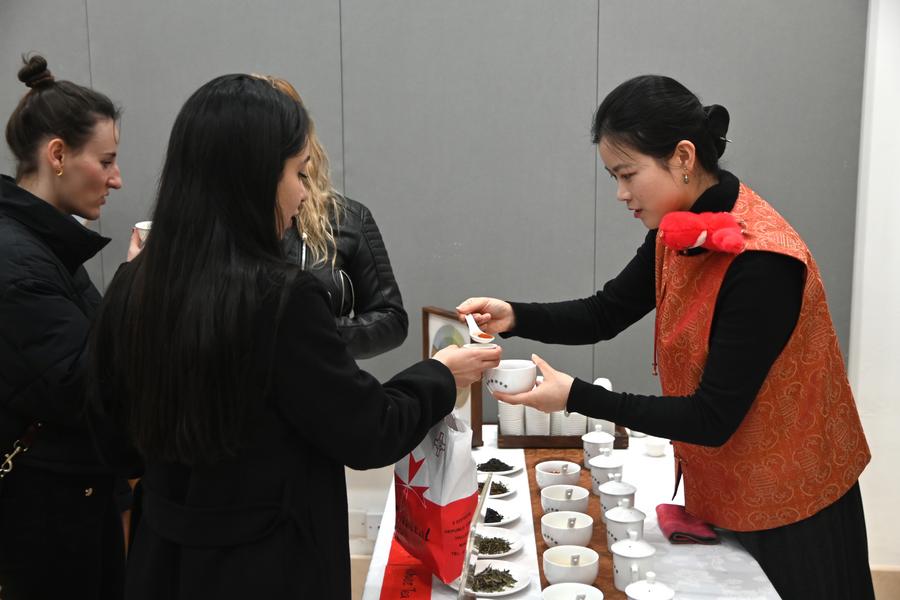 Guests taste Chinese tea during a temple fair at the China Cultural Center in Valletta, Malta, on Feb. 8, 2025. (Photo by Jonathan Borg/Xinhua)