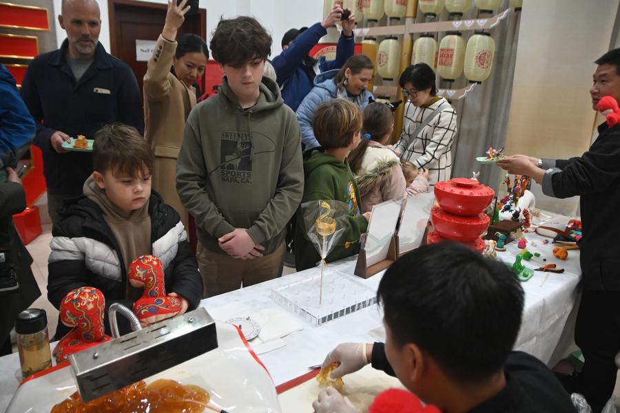 Guests observe the creation of a sugar painting during a temple fair at the China Cultural Center in Valletta, Malta, on Feb. 8, 2025. The temple fair celebrating the traditional Chinese Spring Festival was held here on Saturday, drawing around 300 attendees eager to experience the richness of Chinese culture and intangible cultural heritage. (Photo by Jonathan Borg/Xinhua)