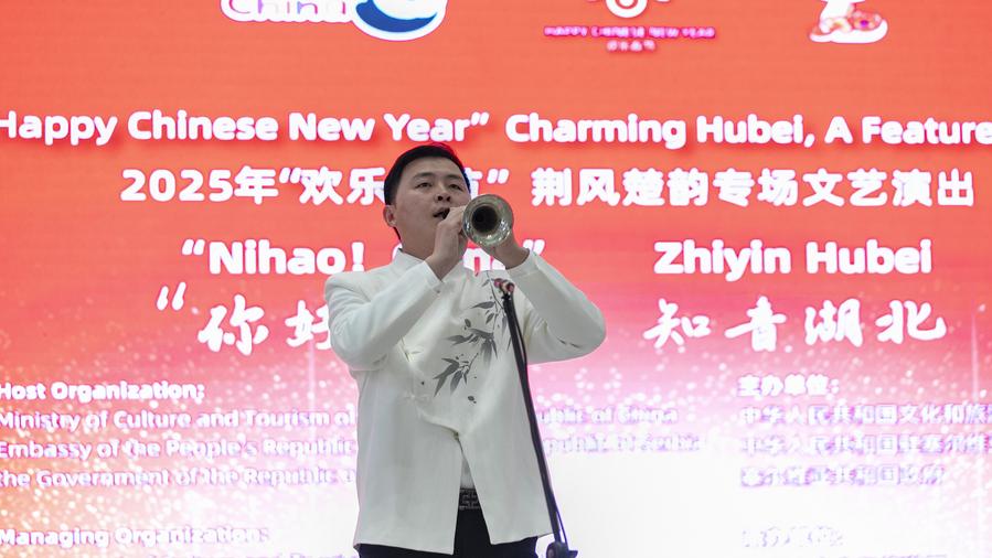 An artist from the Hubei Performing Arts Group performs a suona solo, "Snow Lantern Festival," during "Charming Hubei" flash mob in Belgrade, Serbia, Feb. 8, 2025. The Arts Group brought a vibrant showcase of Chinese folk arts to Belgrade, on Saturday evening with a flash performance at Galerija Shopping Mall, as part of Serbia's Spring Festival celebrations. (Photo by Wang Wei/Xinhua)