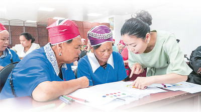 In a wooden stilt house in Luomian village, southwest China's Guizhou Province, Miao embroidery designer Jiao Hongxiu, dressed in modernized Miao costumes, was instructing an embroiderer to add silver ornament elements to a geometric pattern to create something both traditional and fashionable.