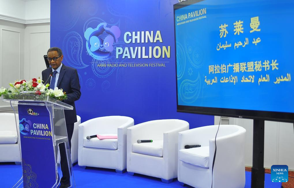 Abdelrahim Suleiman, director general of the Arab State Broadcasting Union (ASBU), speaks during a Chinese audiovisual works presentation as part of the 25th Arab Radio and Television Festival in Yasmine Hammamet, a resort town in northeast Tunisia, June 24, 2025. More than 100 Chinese audiovisual works, including TV series, documentaries and cartoons, were exhibited at the event. (Photo by Adel Ezzine/Xinhua)