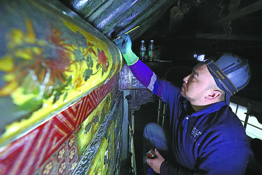 A relic restorer works on a painting on an arcade. [PHOTO BYZHU XINGXIN/CHINA DAILY]