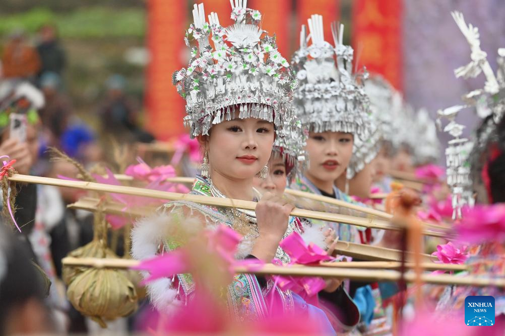 Women of Miao ethnic group stage a folk performance during the "Bainiaoyi" Lusheng festival in Gandong Township, Rongshui Miao Autonomous County of Liuzhou, south China's Guangxi Zhuang Autonomous Region, Feb. 5, 2025. During "Bainiaoyi" Lusheng festival, a traditional festival annually held in Gandong Township, people of different ethnic groups gather together to demonstrate traditional ethnic attire, blow Lusheng, a traditional reed-pipe wind instrument, and perform traditional dancing. (Xinhua/Huang Xiaobang)
