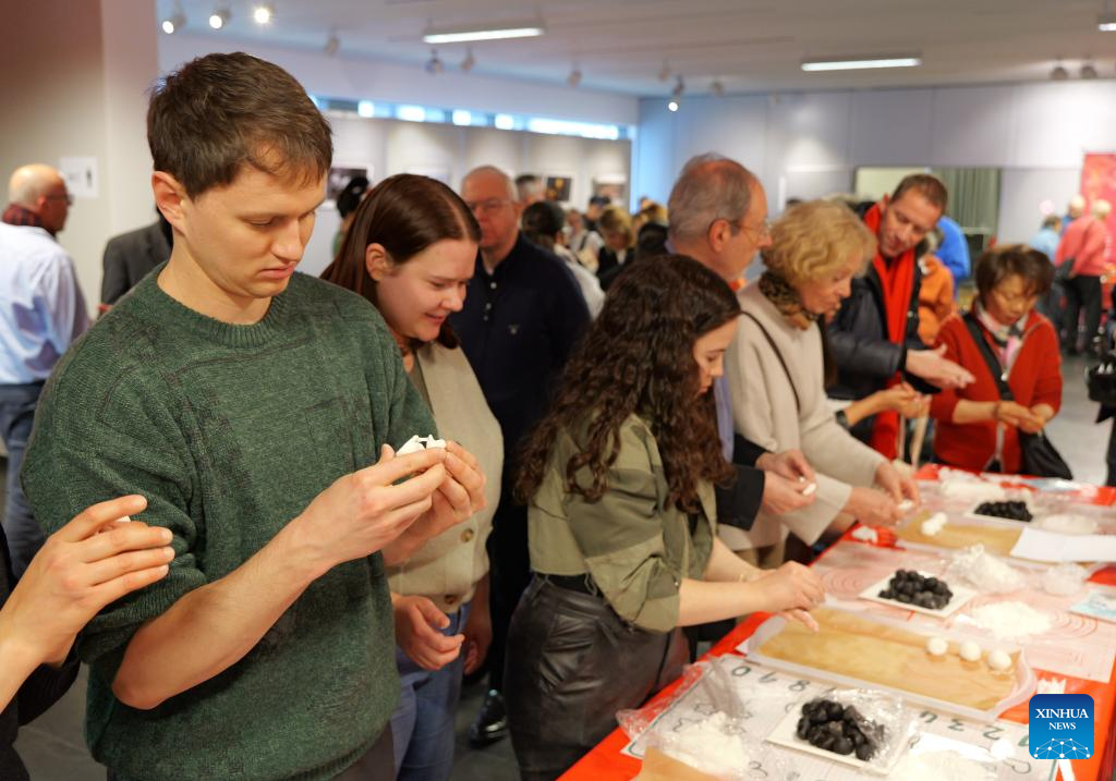 People try to make glutinous rice balls during a cultural event at the Chinese Cultural Center in Berlin, Germany, Feb. 8, 2025. (Xinhua/Tai Sicong)