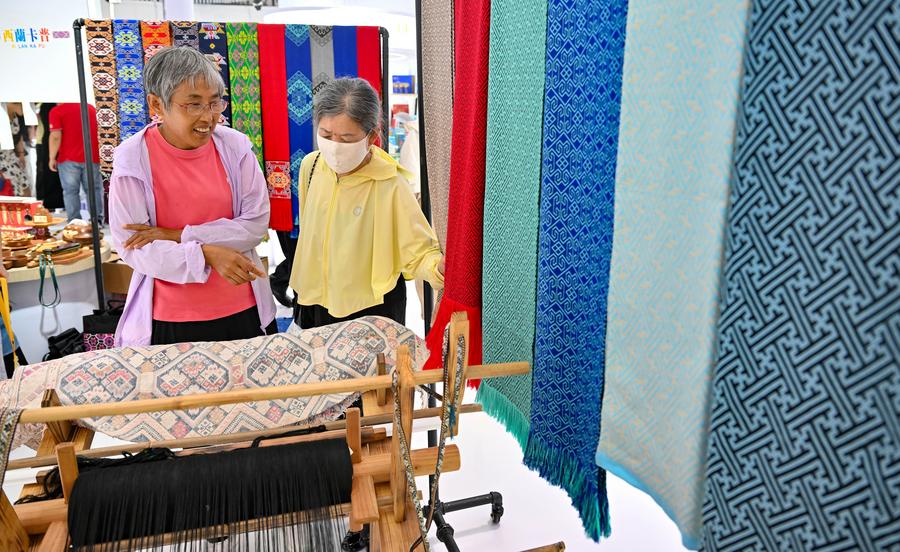 People select products of Xilankapu brocade, a national intangible cultural heritage, at the 5th China International Consumer Products Expo (CICPE) in Haikou, south China's Hainan Province, April 15, 2025. (Xinhua/Guo Cheng)