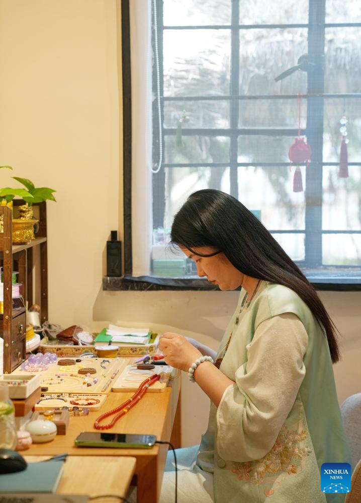 Li Wen makes a bracelet at "Jinkun Xinshe", a traditional Chinese-style handicraft studio, in Xuhui District of Shanghai, east China, April 18, 2025. "Jinkun Xinshe" was founded by Si Fangfang and Li Wen, who have converted a foreign-style house into a tranquil and elegant space to offer traditional handicraft courses such as bracelet making, rope braiding, incense crafting, and gold foil painting.
