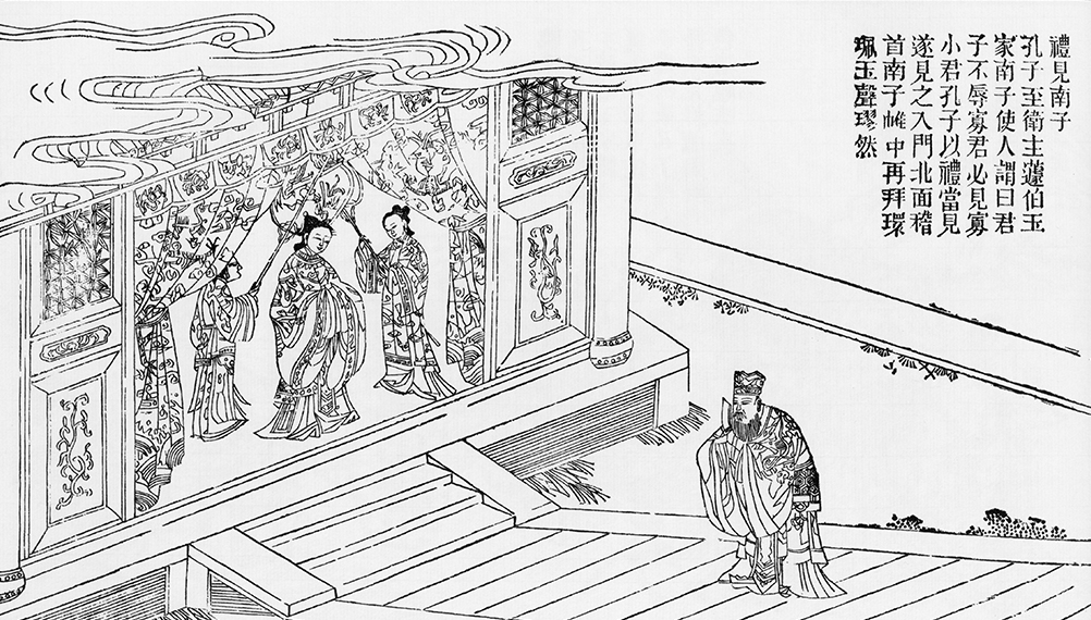 After Confucius left Kuang county and returned to Wei state, Nanzi, the duchess of Wei state, sent someone to see Confucius and said, "All gentlemen from all around the world who come to Wei state to visit the duke must also visit the duchess. The duchess hopes to see you today." Confucius then went to visit the duchess. When they met, instead of talking face to face, they were talking across the curtain. To show respect, Confucius worshiped on bended knees. The duchess bowed down twice behind the curtain to show her respect to the master. Confucius talked with the duchess for quite a long time before he came out, which made Zilu confused and unhappy as he thought the master should not spend too long time alone with a lady. He blamed Confucius for this. Confucius replied, "I didn't mean to visit the duchess. But since I visit her, I should pay due respect to her. If it's not like what I said, just let the heaven punish me!"