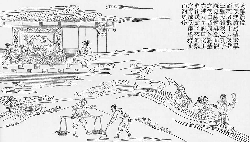 Soon after Confucius arrived in the capital of Chen state, Duke Min of Chen state invited him to climb the Lingyang tower which was about to be completed. Many labors were put to death because of the slow progress of construction. Duke Min was also planning to execute three officials in charge of construction supervision. He asked Confucius, "Did Duke Wen of Zhou dynasty execute labors when he was building the Ling tower?" Confucius replied, "No. At that time, the labors respected Duke Wen as their father, so they worked diligently." Duke Min was ashamed after hearing this, so he released the three officials and stopped the construction.