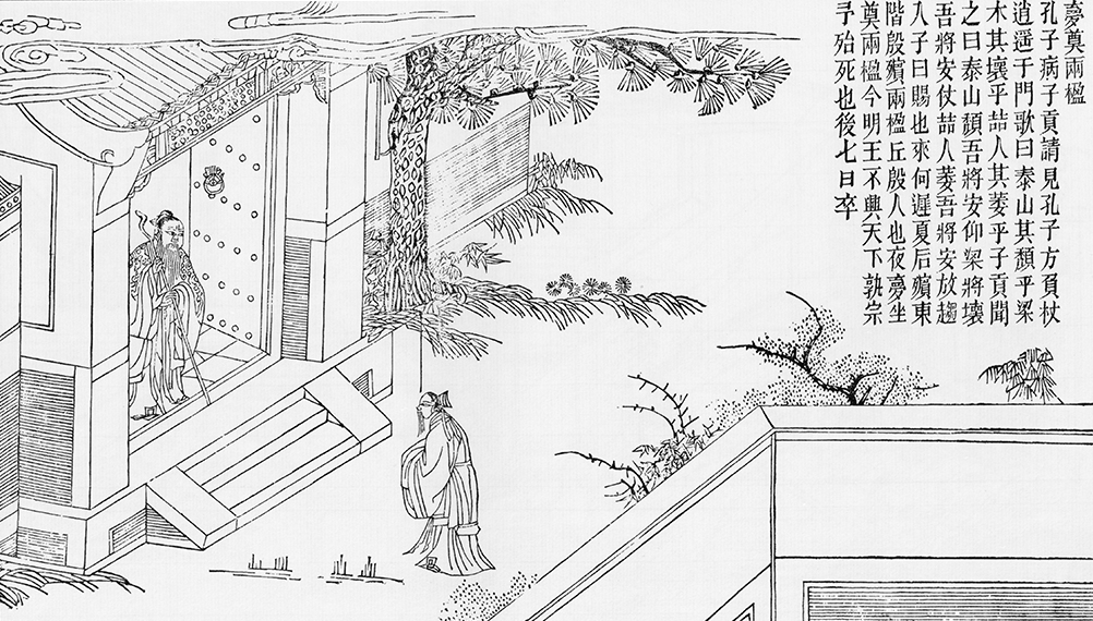 In the 16th year of the reign of Duke Ai of Lu state, Confucius was seriously ill. He plodded with a walking stick, walking out of the door and singing, "Mount Tai is about to crumble; The roof beam is about to break; The wise man is about to wither away like a plant!" Hearing this, Zigong said, "What can I look up to if Mount Tai is about to crumble? Where should I place the rafters if the roof beam is about to break? And who should I follow if the wise man is about to wither away?" So Zigong quickly walking in. Seeing him, Confucius said, "Zigong, why are you so late? I remember the traditional funeral practices. Coffins of Xia people are put in the east for people to pay respect to the dead while coffins of Yin people are put between the two pillars. I am the offspring of Yin people. Last night, I dreamed that I was sitting between two pillars. Intelligent kings do not arise, then who will make me sit between two pillars to pay me respect? This probably an omen of the end of my life." Seven days later, the master passed away.