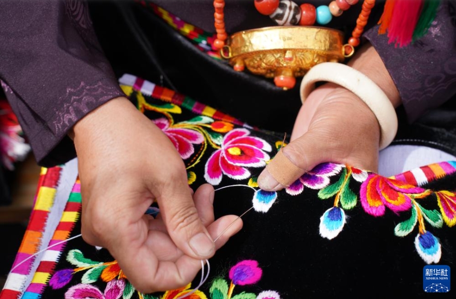 四川省甘孜蔵族自治州丹巴県巴底鎮色足村で、嘉絨蔵族刺繍甘孜蔵族自治州無形文化遺産伝承者の阿姆さんが花の刺繍をする様子(10月12日撮影・呂明響)。