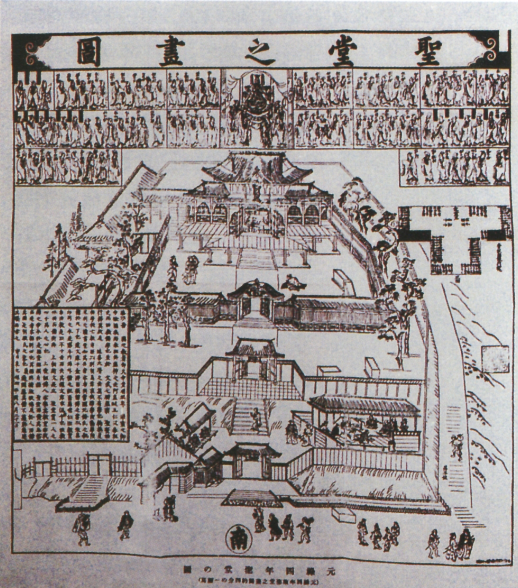 寛永七年(1630)三代将軍徳川家光は朱子学を尊崇する林羅山に聖堂と塾を建立し、林家が教官を世襲するように、儒学で幕府臣下の子弟を教育することを命じ、建立当時は孔子廟と呼ばれていた。元禄三年(1690)五代将軍綱吉は聖堂と塾を湯島に移築し、中国の慣例に従って先聖殿を「大成殿」と改称し、周囲の付属建物を「聖堂」と呼んだ。その後、聖堂は湯島聖堂の中の大成殿を指すようになった。大成院の建物はもともと中国様式を模造し、赤い柱にペンキを塗り、外観は緑色だったが、今回の拡張工事で水戸孔子廟の通りに改築した建物は黒く塗った。大正十一年(1922)湯島聖堂は国家級史跡に指定されている。1923年の関東大震災で徳門と水屋を除いて全焼し、聖堂はいったん破壊されたが、1935年(昭和10年)に伊東忠太が設計し、大林組が施工再建した。1975年に台北ライオンズクラブより贈る世界最大の孔子像がここに安置された。ここには孔子のほかに、孔子の四人の高足(顔子、曽子、子思、孟子)の像を安置して祭祀されていた。