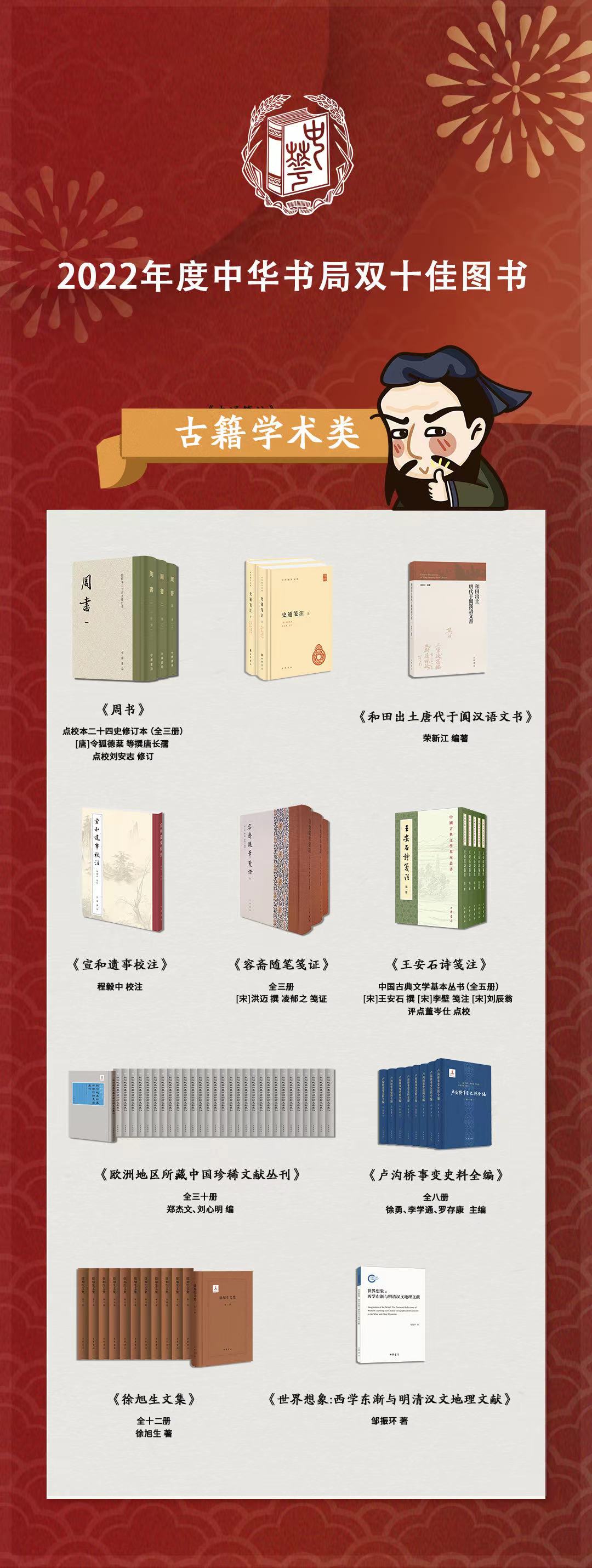 2022년은 중화서국 창건 110주년으로 도서 선정에서 특별히 ‘부흥문고(제12·3편)’, ‘중화선현인물이야기집’ 등 ‘연도치경도서(年度致敬圖書)’ 도서 작품 2편을 내놓았다. 이번 쌍10대 도서 선정에서는 모두 44종의 도서가 선정되었다. 이 도서들은 모두 2021년 12월 1일부터 2022년 11월 30일까지 출간된 신간 도서에서 엄선한 것으로, 고서 학술과 대중 인문 두 종류로 나누었다. 이 도서들은 중화서국의 우세인 전통문화 출판에서 다년간 노력한 최신 성과를 대표하며 시대와 더불어 발전하는 특색을 뚜렷하게 나타내고 있다.