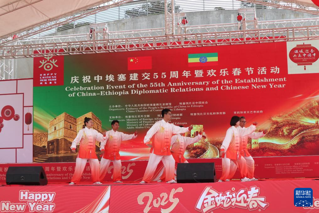 1월 12일(현지시간), 에티오피아 수도 아디스아바바 우정광장에서 열린 '중국-에티오피아 수교 55주년 경축 및 즐거운 춘제' 행사에서 공연자들이 태극권 공연을 선보이고 있다. [신화사 류팡창 기자 촬영]