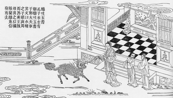 후세 사람들이 공자를 위해 편집한 신기한 이야기다.공자가 태어나기 전날 저녁, 공자궐리에 기린(麒麟)이 내려왔다고 합니다.옥서(玉书)를 구토하면 '수정(水精)의 자손(子孙), 쇠주이소왕(衰周而素王), 징재현명(徵在贤明)'이라고 적혀 있다.공자는 평범한 사람이 아니며, 비록 제왕적 지위에 있지는 않으나 임금의 덕이 있는 소왕(素王)임을 알리려는 것이다.안징은 매우 놀라 색채(色彩) 수건을 기린의 뿔에 묶어 감사의 뜻을 표했다.기린은 날이 밝을 무렵에야 떠났다.이때부터 '린토옥서(麟吐玉书)'는 집안에서 아들을 낳는다는 상서로운 징조로 널리 알려졌다.