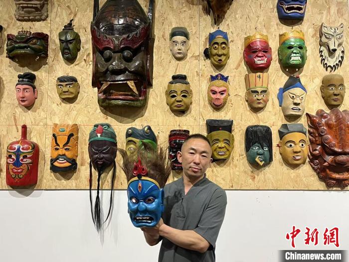 5月4日,湖北恩施州级非物质文化遗产傩面具制作技艺代表性传承人汪儒斌展示他做的傩面具。中新社记者 武一力 摄